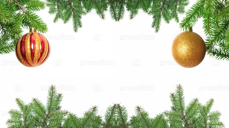 Рождественская рама из сосновой ветви и шары на белом