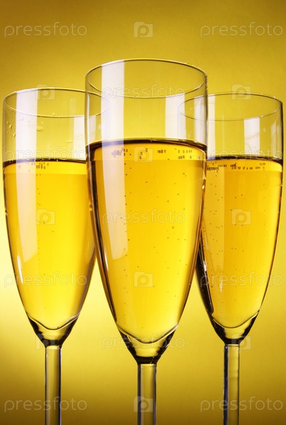 Три бокала шампанского на желтом фоне