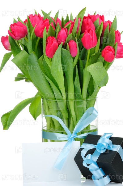 Букет тюльпанов в вазе с запиской и подарком в подарочной коробоке