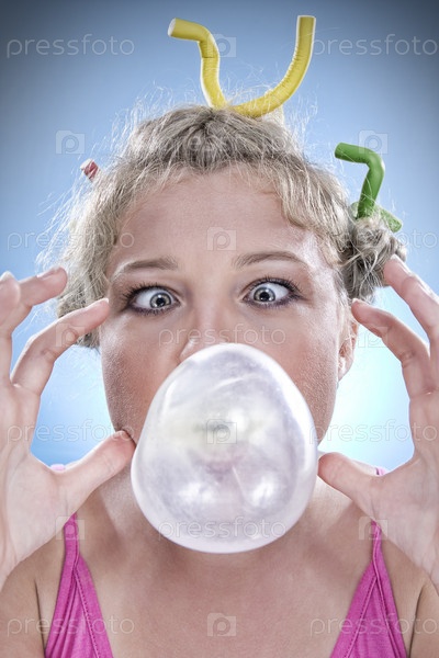 Забавная девушка надувает пузырь из жевательной резинки