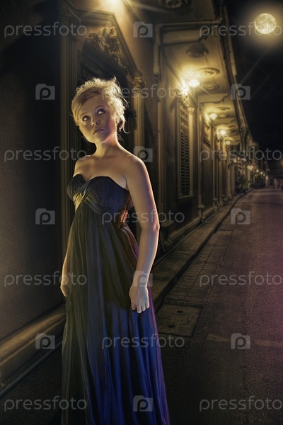 Блондинка в вечернем платье на ночной улице