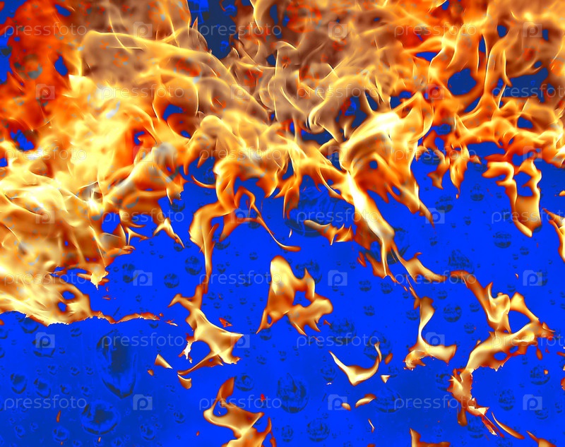 Пылающий огонь на синем фоне с каплями воды