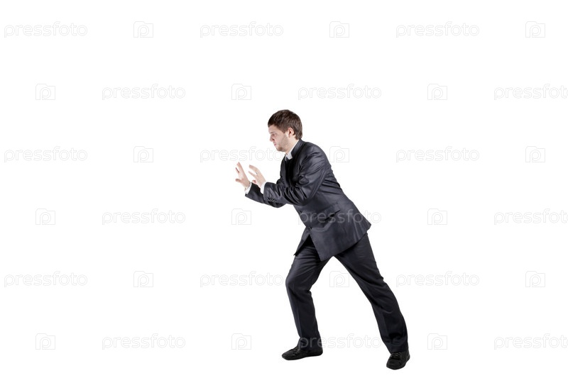 Мужчина в деловом костюме, толкающий невидимый объект. Белый фон