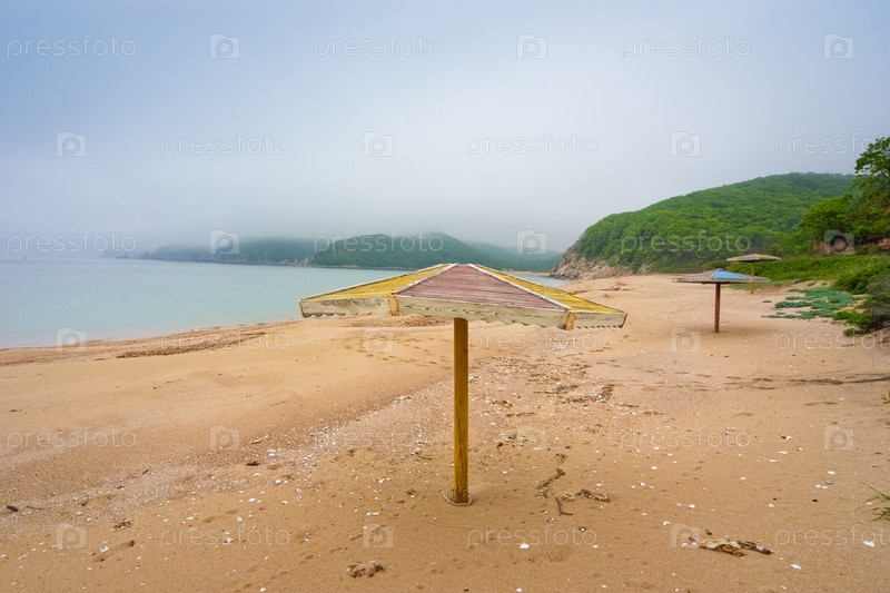 Пустынный песчаный пляж и пляжные зонты на морском берегу