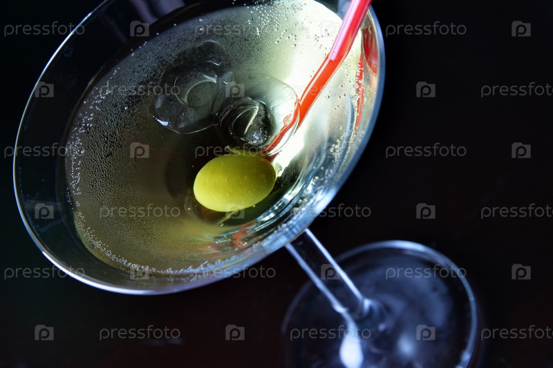 Коктейль с оливкой на черном фоне. Вид сверху