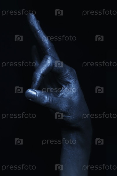 Красивая мужская рука в голубой блестящей краске на черном фоне крупным планом