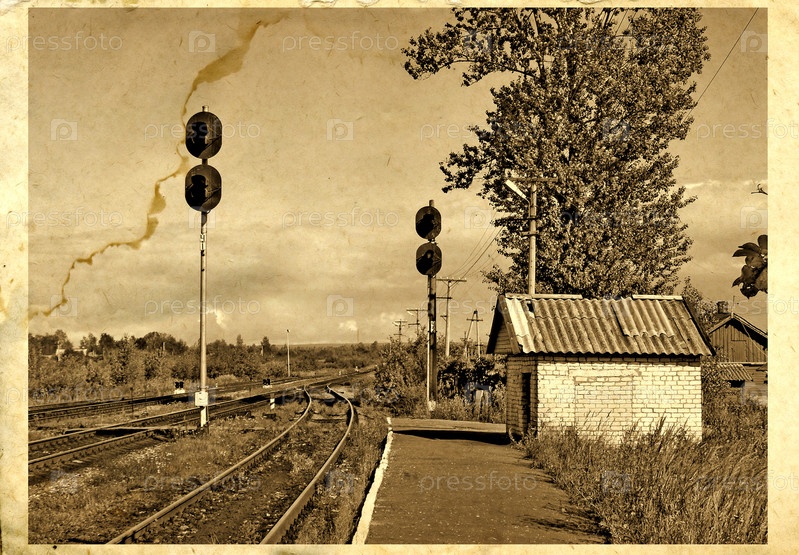 Старая помятая фотография с изображением станции