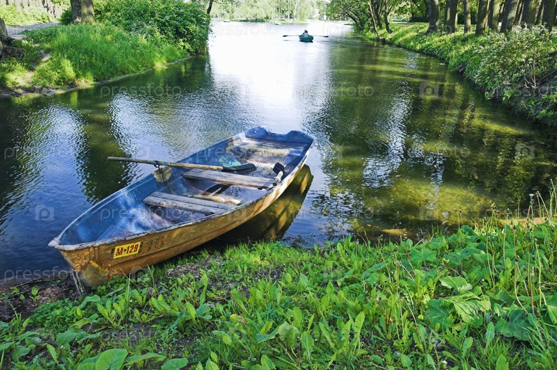 Лодка на берегу реки в летнем парке, Санкт-Петербург, Россия