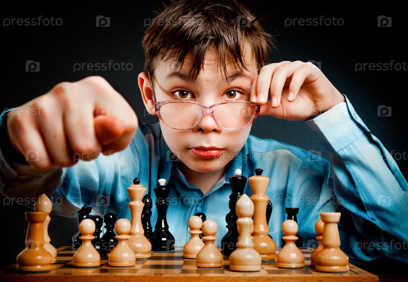 Ботаник в очках показывает фигу, играя в шахматы на черном фоне