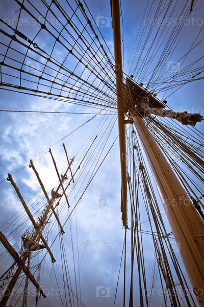 Мачты парусных кораблей на пристани на фоне облачного неба