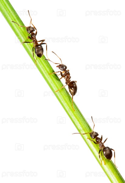 Муравьи на зеленой траве, изолированные на белом фоне