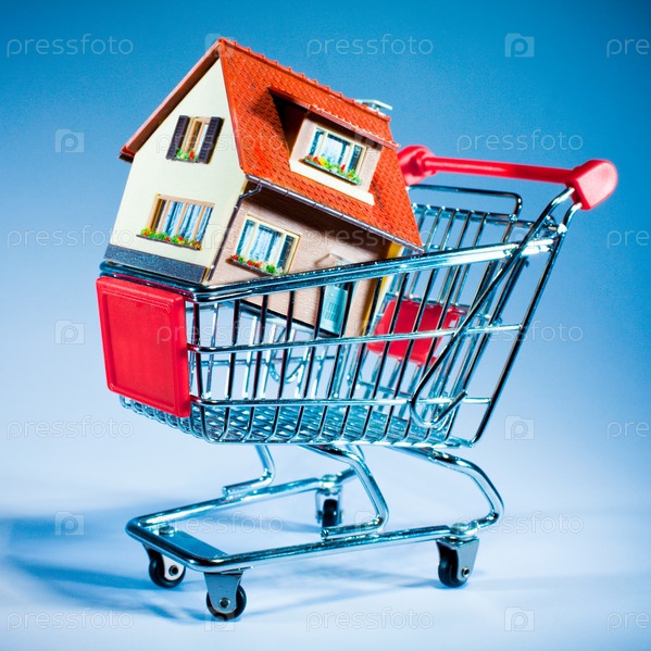 Игрушечный дом в тележке для покупок на голубом фоне