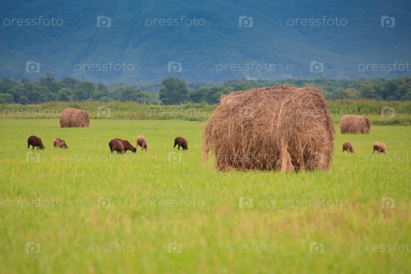 Стадо овец в поле среди стогов сена на фоне гор