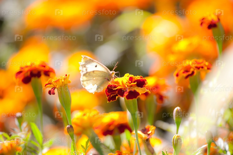 Белая бабочка сидит на ярком садовом цветке