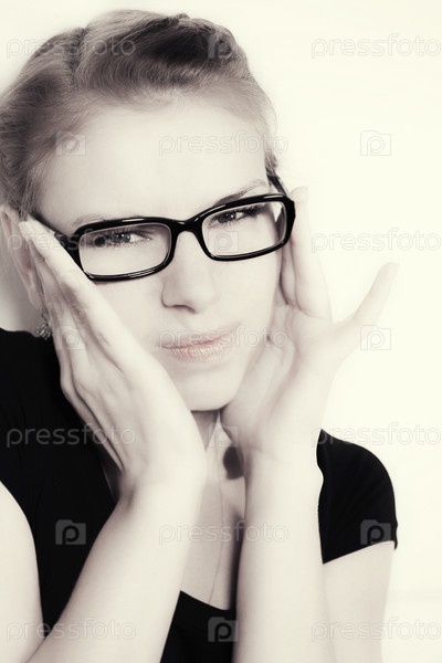 Портрет симпатичной девушки в очках на светлом фоне