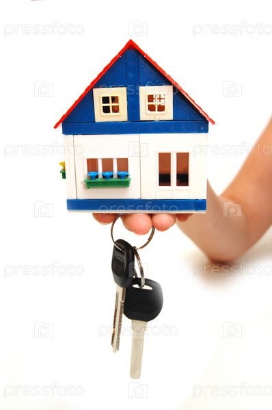 Маленький домик и ключи на руке на белом фоне