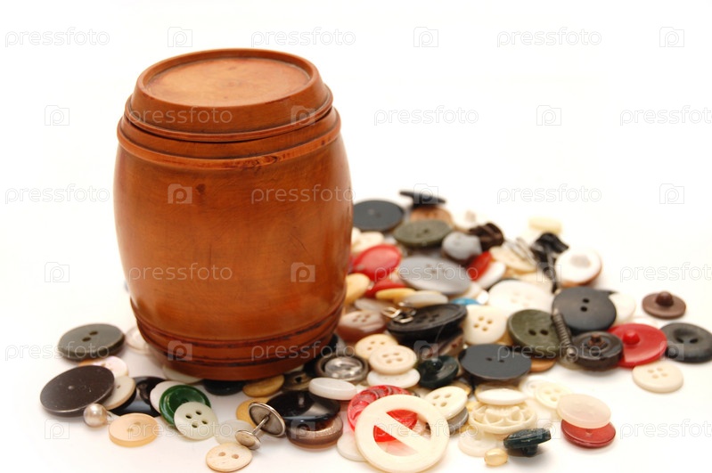 Множество различных пуговиц и маленькая бочка на белом фоне