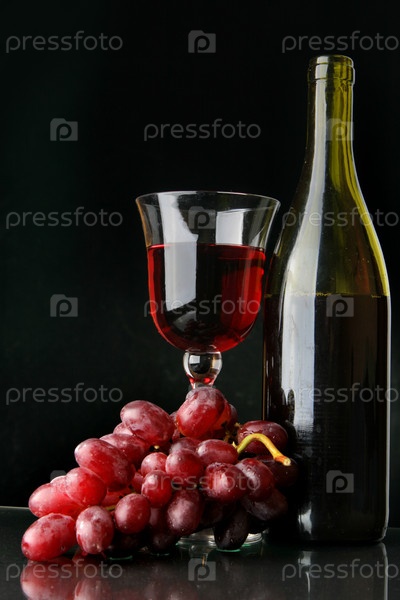 Бутылка красного вина, бокал и гроздь винограда на черном фоне