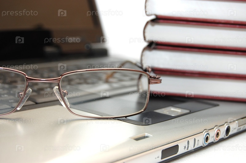 Книги, очки и ноутбук на белом фоне
