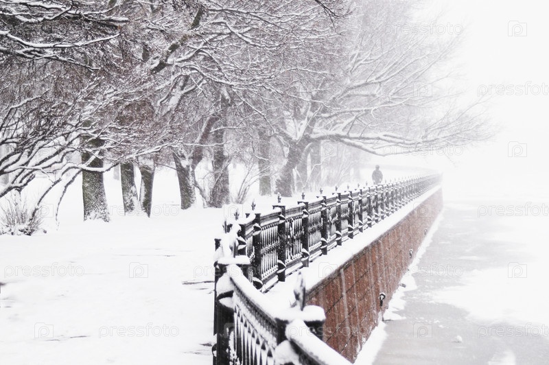 Санкт-Петербург, Кронверкская набережная, въезд на Троицкий мост, снегопад, туман над Невой