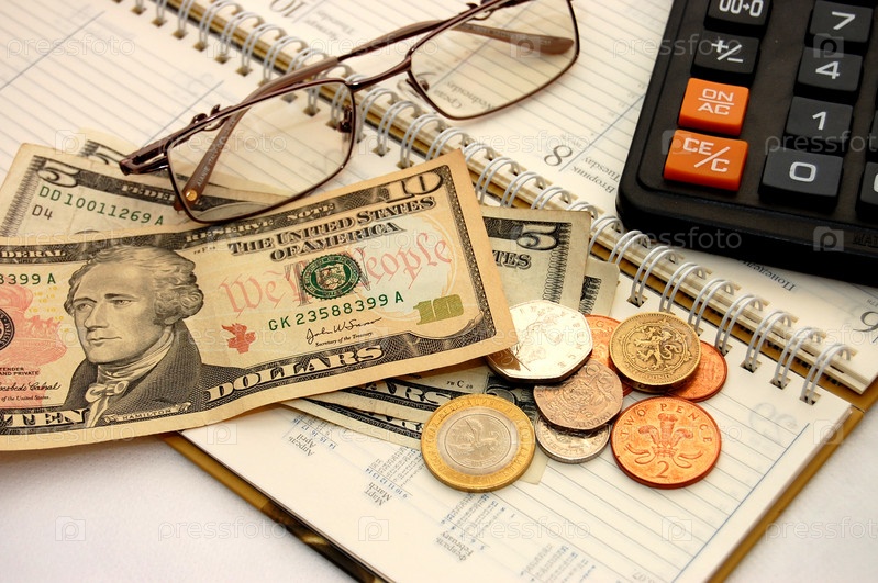 Деньги, очки, калькулятор и ежедневник на белом фоне