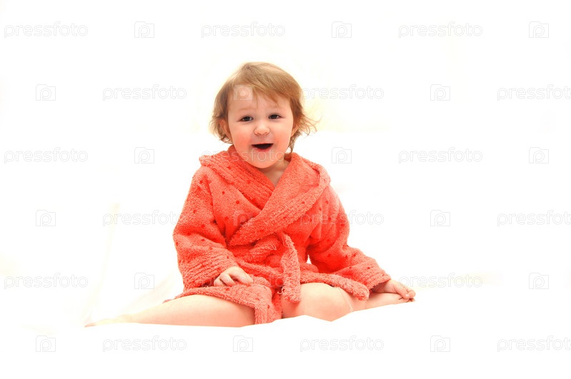 Маленькая девочка в халате на белом фоне