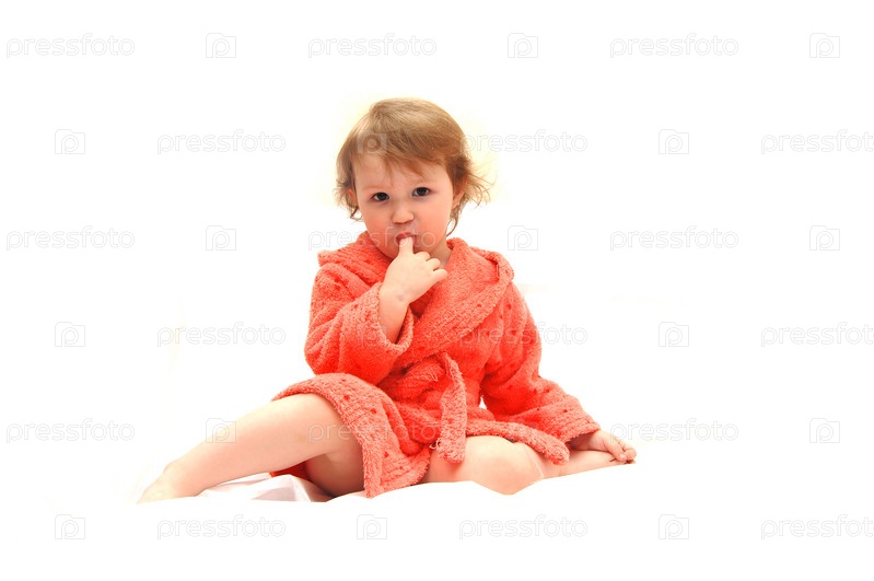 Маленькая девочка в халате на белом фоне