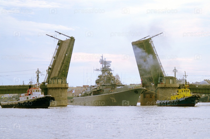 Военно-морской корабль проходит через мост Лейтенанта Шмидта