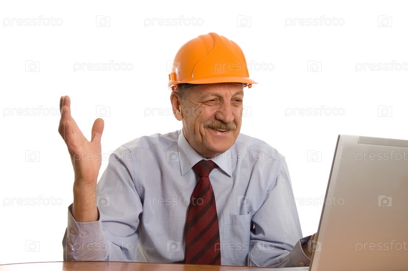 Инженер работает за компьютером на белом фоне