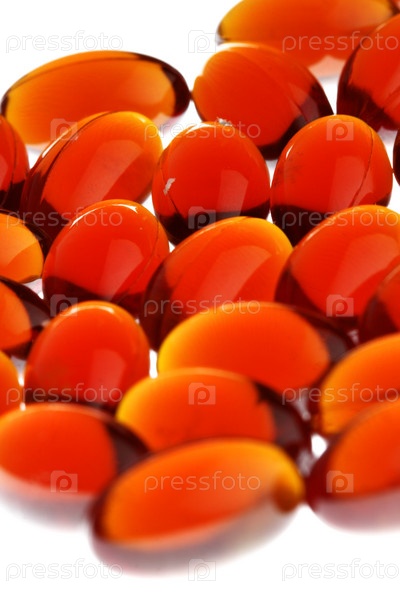 Красные гелевые капсулы на белом фоне