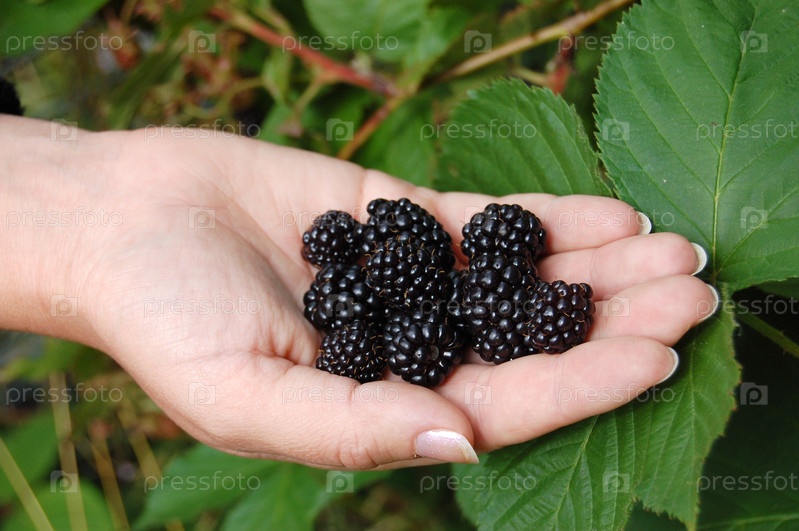 Горсть ежевики в женской руке на фоне листвы