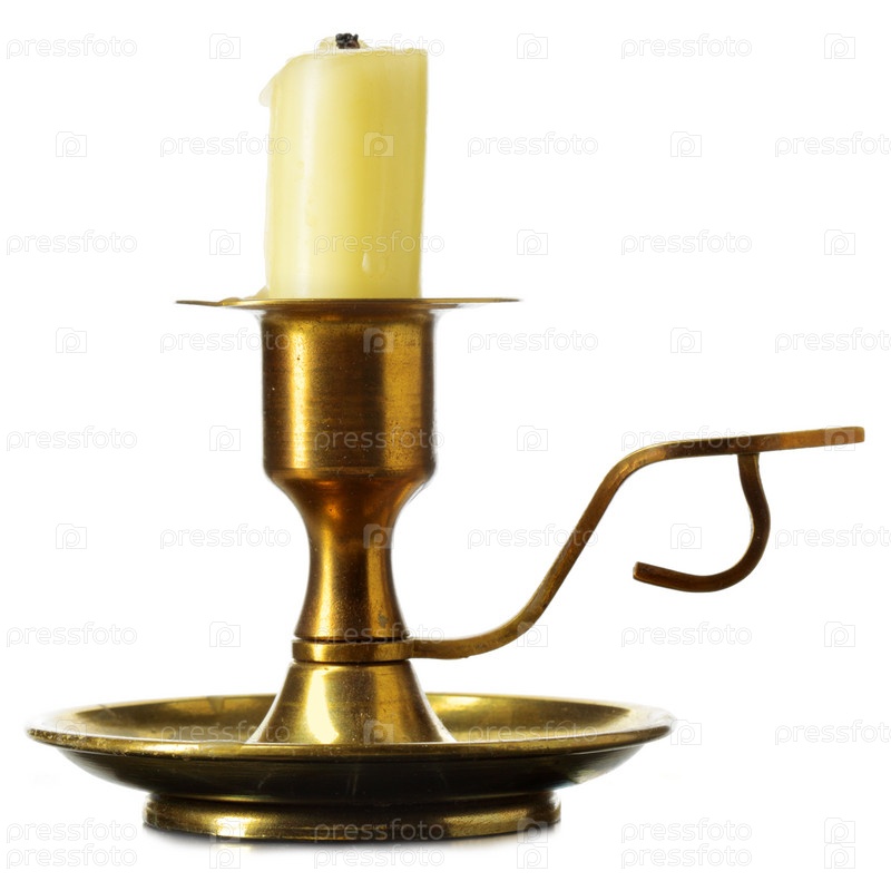 Бронзовый подсвечник со свечой изолирован на белом фоне