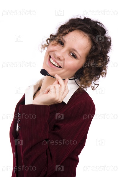 Успешная деловая женщина говорит через наушники с микрофоном.Как я могу вам помочь?Лицо молодой очаровательной уверенной в себе женщины с наушниками
