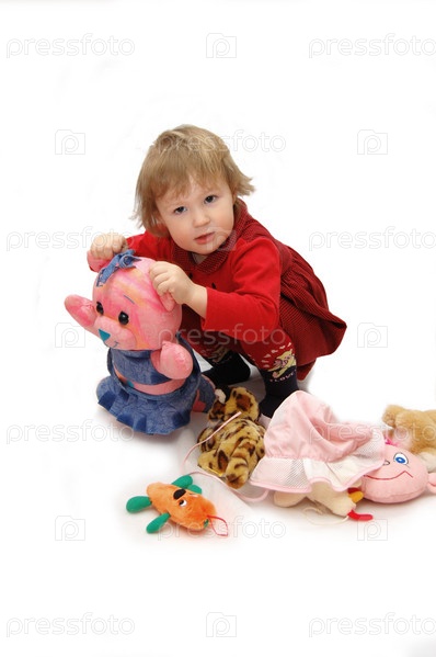 Маленькая девочка среди игрушек на белом фоне