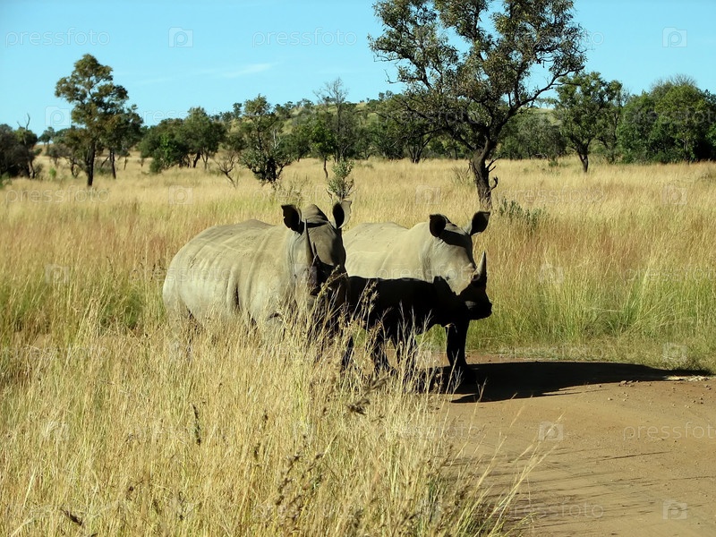 Пара носорогов отправляется в саванну в солнечный день