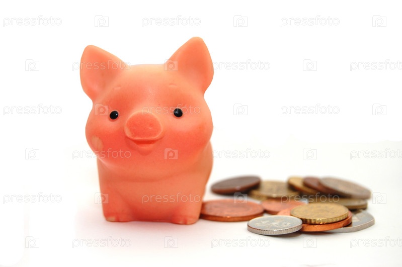 Монеты и свинья-копилка на белом фоне