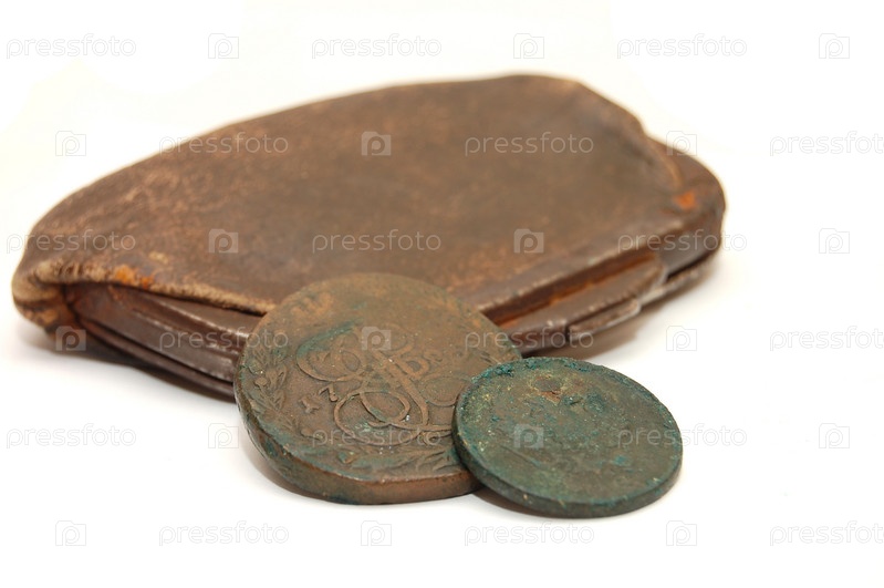 Старинные монеты и кошелек на белом фоне