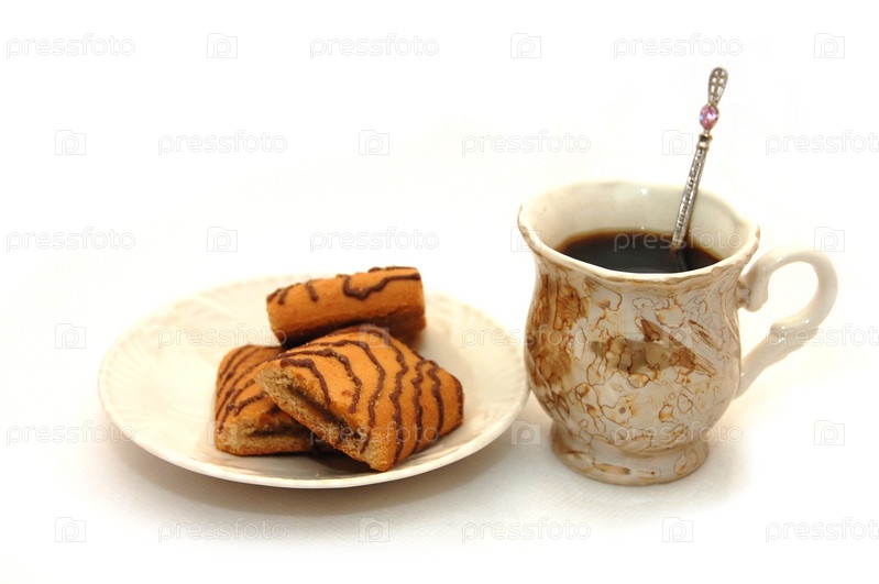 Печенье и чашка кофе на белом фоне