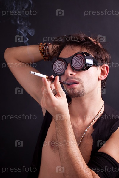 Молодой человек в очках курит сигарету на фоне черной стены