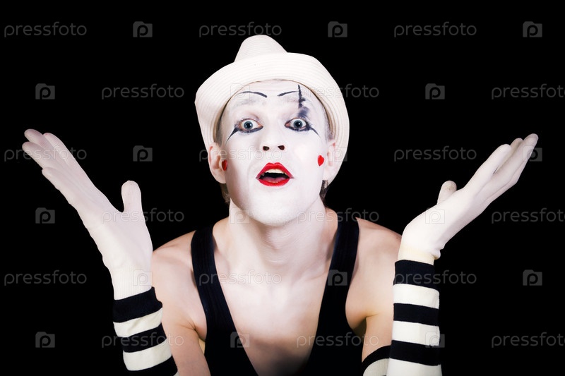 Мим в белой шляпе на черном фоне