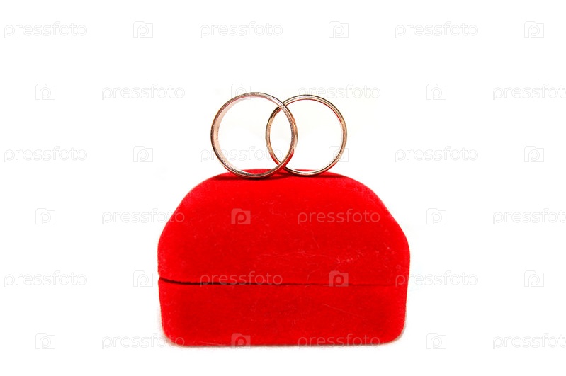 Два обручальных кольца на красной коробочке на белом фоне