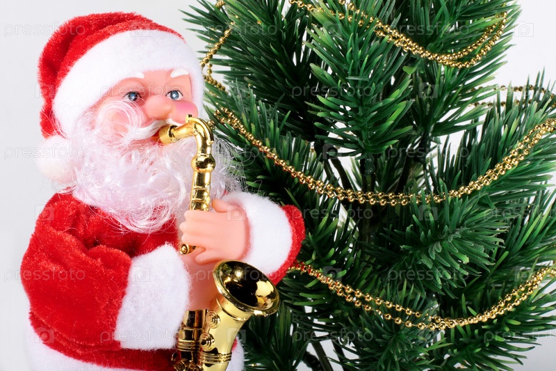 Игрушечный Санта Клаус стоит рядом с елочкой