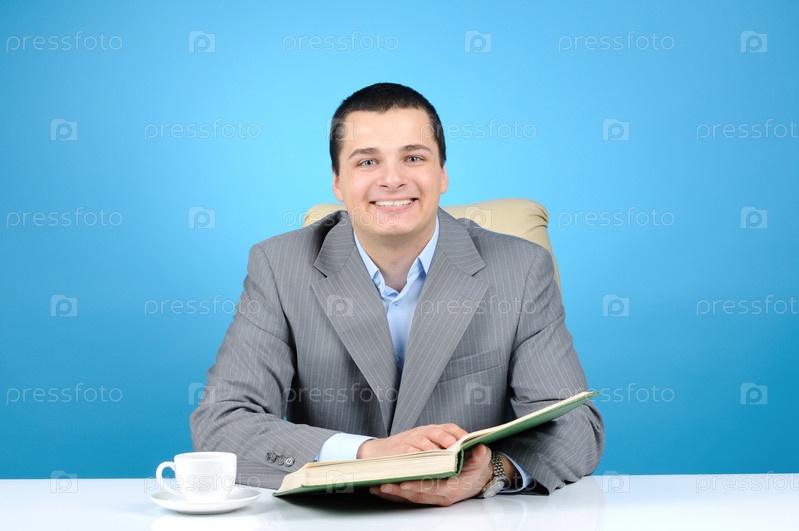 Мужчина сидит в кресле за столом с открытой книгой и чашкой кофе на голубом фоне