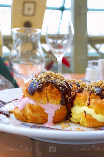 Профитроли с мороженым на столе в ресторане