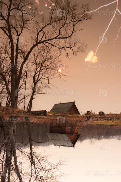 Осенний сельский пейзаж. Дом и дерево на берегу озера