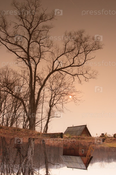 Осенний сельский пейзаж. Дом и дерево на берегу озера