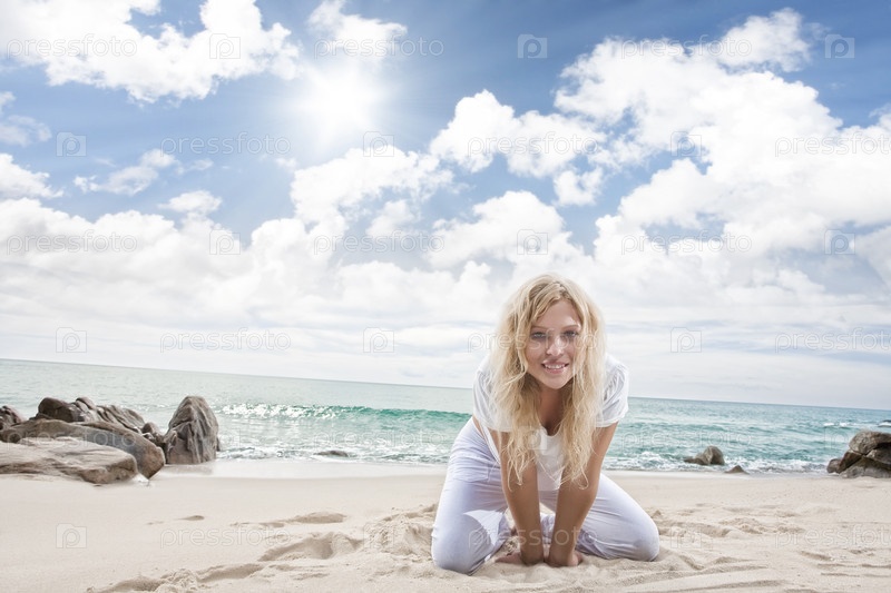 Красивая девушка сидит на песчаном пляже