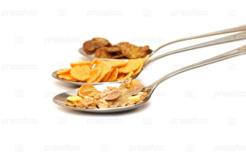 Сухие завтраки в ложках на белом фоне