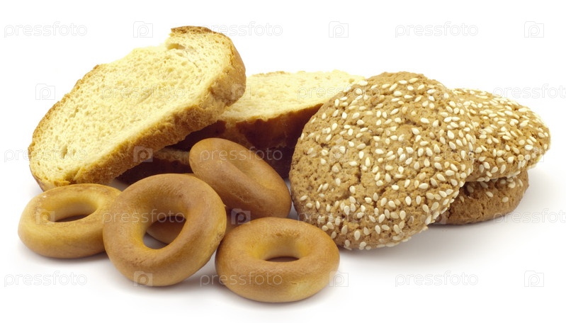 Печенье, сушки и тосты крупным планом, изолированные на белом фоне
