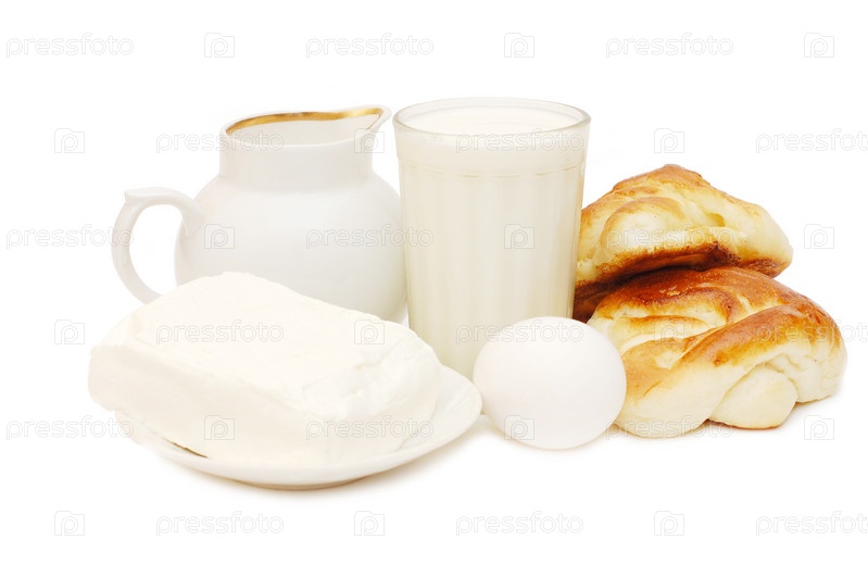 Молоко, яйца, творог и булочки на белом фоне